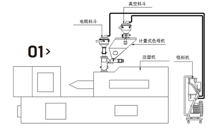 计量式色母混色机适用于新料、次料、色母或添加剂等的自动比例混合。螺杆直径分别为12、14、16mm三种,可演变出四种机型
